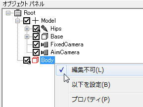 オブジェクト パネルを見ると、本体のメッシュ オブジェクトである「Body」のアイコンには「L」(ロック)マークが入っていて編集不可になっています。「Body」を右クリックしてポップアップ メニューを表示し、「編集不可」をクリックしてチェックを外し、編集可能にします。